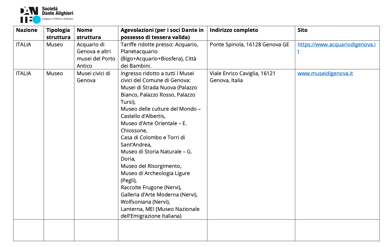 Auf dieser Seite finden unsere Mitglieder eine Übersicht mit weiterführenden Links zu den Vereinbarungen und Kooperationen, die von der Società Dante Alighieri (Zentralstelle in Rom) mit verschiedenen Institutionen und Unternehmen abgeschlossen wurden.